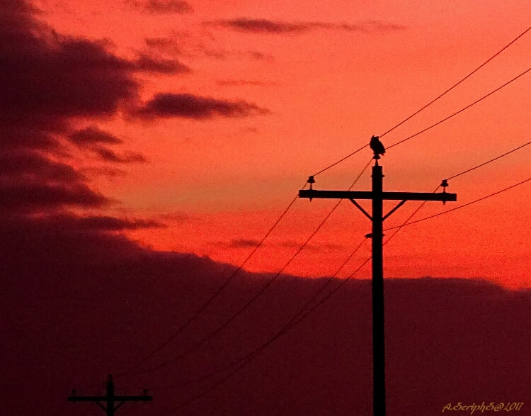 He slowed and stopped. The owl stayed and watched him and turned towards the east with the light growing for sunrise. He asked and heard that the Four Owls meant the four winds. Spirit of the four directions, and the ancestors, were honoring him and his choice. It was confirmation. He continued on towards the east as the owl watched from it's comfortable perch. Just before sunrise a Hawk was on a pole. He too was looking to the east, to the new direction, watching as the colors of the new day grew.