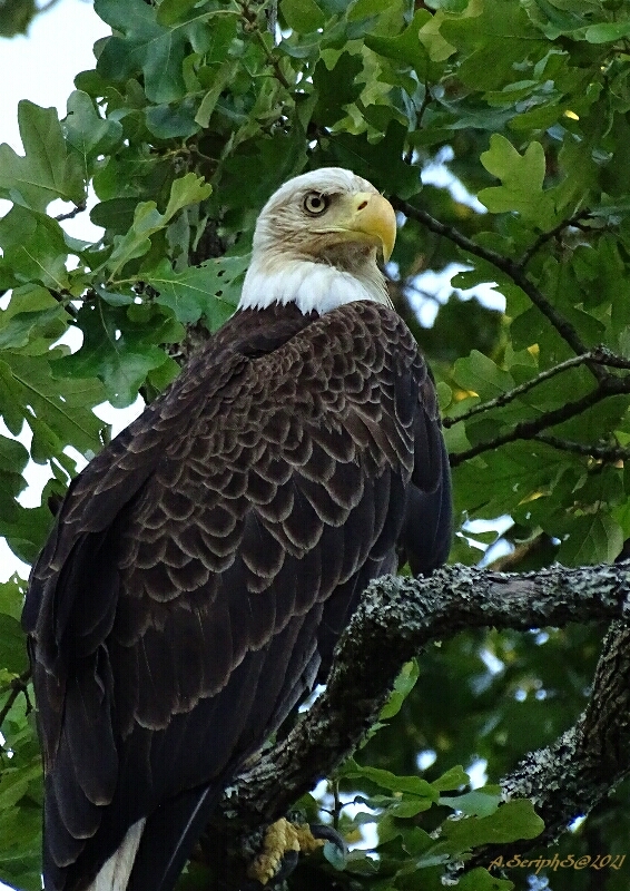 He was at camp mid morning on another beautiful sunny day. There was a slight breeze, birds sang, squirrels ran about. All was fine in the world. Then he saw giant wings through the trees. An Eagle was flying right past his camp. He watched it zoom past and wondered if it was maybe the mom he saw often on the island nearby. The Eagle looked over at him and immediately stalled. He flipped his wings straight up and down and rolled a tight corner directly into camp. He flew right over his head and gently perched on a low limb right above his camper. The Eagle definitely knew him and wanted to come say Hi. He reached out and listened carefully. What he heard was something like - Oh, So this is where you live. Aha. - As he looked he recognized the Eagle. Yes it was the older male from the cove a few days ago. The one who left him the crystal. He was filled with Joy seeing him again. He thanked the Eagle for the gift and for stopping on his way by. He went in the camper and got the crystal out and held it up smiling. The Eagle sat there beaming like he was glad it was appreciated.